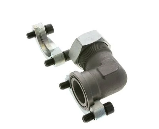 This is an elbow SAE flange with a cutting ring connection port. It adheres to SAE Code 61 (3000-5000 psi working pressure) and has an SAE-4 mounting pattern size of 1-1/2 inch. Connection 2 is a 42 mm cutting ring with an M52x2 union nut. It has a flange diameter of 60.3 mm. The body is made of zinc plated steel with an NBR seal. The maximum pressure is 160 bar (2320 psi) and the fitting is suitable for temperatures from -30 to 90 °C (-22 to 194 °F). It is made in accordance with the ISO 6162-1.