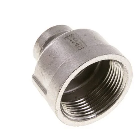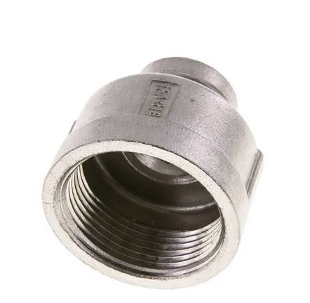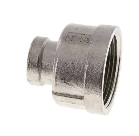 This sleeve (reducing socket) is designed with reducing NPT threads (round body). Connection 1 has female NPT 1 1/4 inch threads. Connection 2 has female NPT 1/2 inch threads. It is a straight fitting. It is made out of stainless steel (1.4408). At 20 °C (68 °F), it can handle a maximum pressure of 16 bar (232 psi).