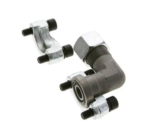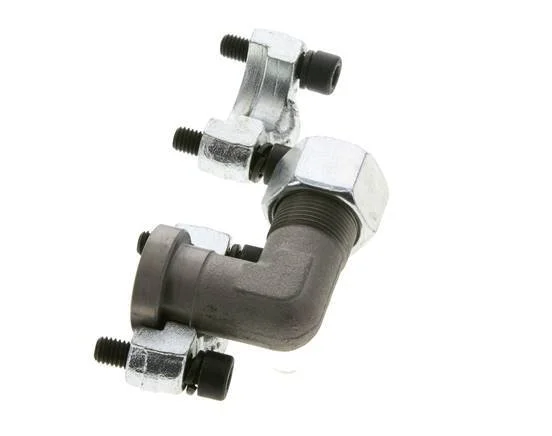 This is an elbow SAE flange with a cutting ring connection port. It adheres to SAE Code 62 (6000 psi working pressure) and has an SAE-4 mounting pattern size of 1/2 inch. Connection 2 is a 16 mm cutting ring with an M24x1.5 union nut. It has a flange diameter of 31.7 mm. The body is made of zinc plated steel with an NBR seal. The maximum pressure is 400 bar (5800 psi) and the fitting is suitable for temperatures from -30 to 90 °C (-22 to 194 °F). It is made in accordance with the ISO 6162-2.