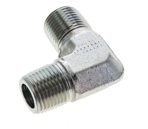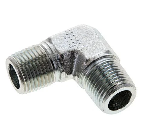 This elbow fitting is designed with female threads. Connection 1 has male NPT 1/2 inch threads. Connection 2 has male NPT 1/2 inch threads. It is an elbow fitting. It is made out of steel and is galvanic/electrolytic zinc plated for surface protection. At 20 °C (68 °F), it can handle a maximum pressure of 225 bar (3263 psi). The input and the output are at a 90° angle.