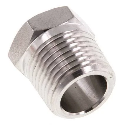 This reducing nipple is designed with male and female threads. Connection 1 has male NPT 1/2 inch threads. Connection 2 has female NPT 3/8 inch threads. It is a straight fitting. It is made out of stainless steel (1.4571). At 20 °C (68 °F), it can handle a maximum pressure of 210 bar (3046 psi).