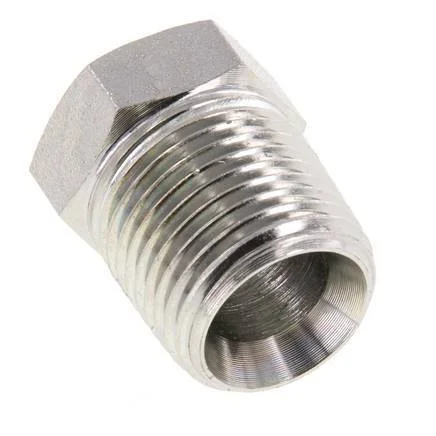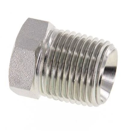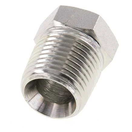 This reducing nipple is designed with male and female threads. Connection 1 has male NPT 1/2 inch threads. Connection 2 has female NPT 3/8 inch threads. It is a straight fitting. It is made out of steel and is galvanic/electrolytic zinc plated for surface protection. At 20 °C (68 °F), it can handle a maximum pressure of 210 bar (3046 psi).