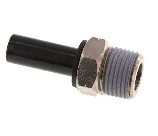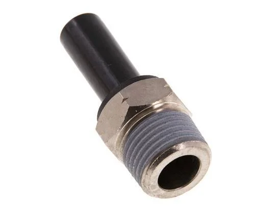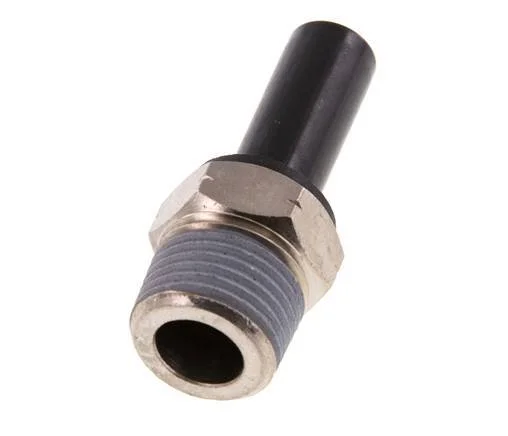 This is a plug-in fitting. It has connection ports to connect a push-in fitting to a hose, pipe or another pneumatic component. Connection 1 is a 1/2 inch (12.7 mm) plug, also called a plug-in connection and connection 2 has 1/2 inch NPT male threads. The male thread connection has PTFE-coating. The body is made of PBT. The connection ports are made of nickel plated brass and PBT. The seal material is NBR. The operating pressure range is -0.95 to 10 bar (-14 to 145 psi), making it suitable for vacuums. The fitting is suitable for temperatures from 0 to 60 °C (32 to 140 °F).