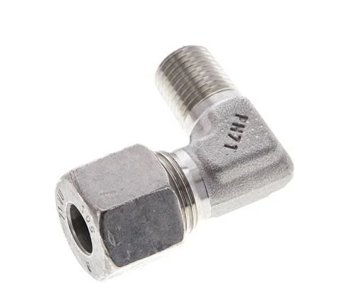 This elbow screw in connection is designed with female threads and a cutting ring connection. Connection 1 has male NPT 1/4 inch threads. Connection 2 is a 10 mm cutting ring. It is an elbow fitting. It is made out of stainless steel (1.4571). It is suitable for media within a temperature range of -60 °C to 400 °C (-76 °F to 752 °F). At 20 °C (68 °F), it can handle a maximum pressure of 630 bar (9138 psi). The input and the output are at a 90° angle. According to the DIN 2353, it has an S (heavy) load class. It is made in accordance with the DIN EN ISO 8434-1 (DIN 2353). They have a 3-part design.