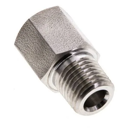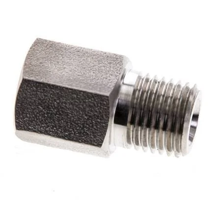This extension is designed with male and female threads. Connection 1 has male NPT 1/4 inch threads. Connection 2 has female NPT 1/4 inch threads. It is a straight fitting. It is made out of stainless steel (1.4571). At 20 °C (68 °F), it can handle a maximum pressure of 345 bar (5004 psi).