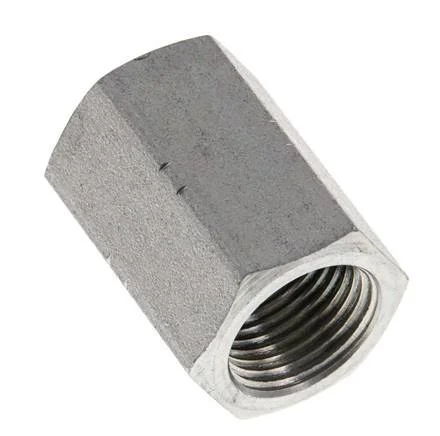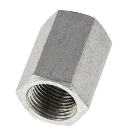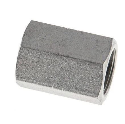 This sleeve (reducing socket) is designed with reducing NPT threads (round body). Connection 1 has female NPT 1/4 inch threads. Connection 2 has female NPT 3/8 inch threads. It is a straight fitting. It is made out of steel and is galvanic/electrolytic zinc plated for surface protection. At 20 °C (68 °F), it can handle a maximum pressure of 210 bar (3046 psi).