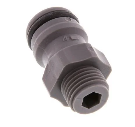 Plastic garden hose fitting with 1/4 male thread, suited for GARDENA fittings.