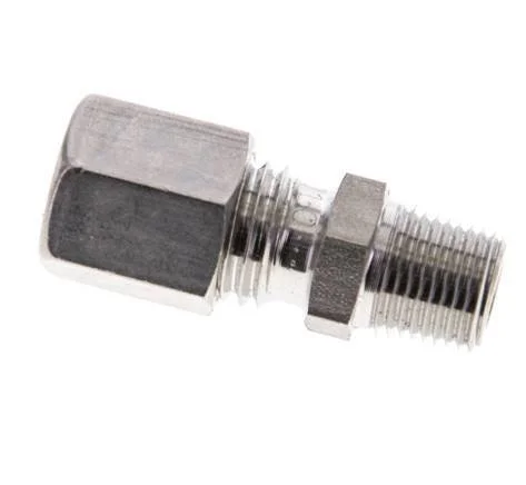 This straight screw in connection is designed with male threads and a compression ring fitting connection. Connection 1 has male NPT 1/8 inch threads. Connection 2 is a 6 mm compression ring. It is a straight fitting. It is made out of stainless steel (1.4571). It is suitable for media within a temperature range of -60 °C to 400 °C (-76 °F to 752 °F). At 20 °C (68 °F), it can handle a maximum pressure of 315 bar (4569 psi). According to the DIN 2353, it has an L (light) load class. It is made in accordance with the DIN EN ISO 8434-1 (DIN 2353). They have a 3-part design.