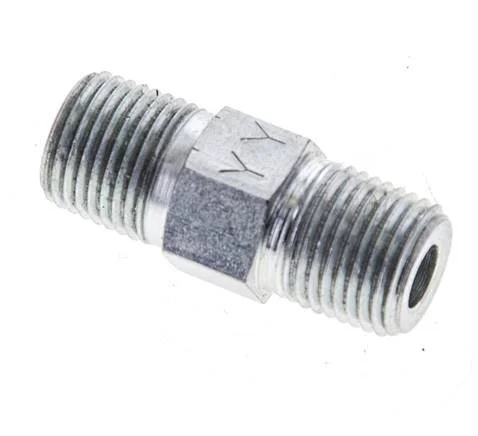 This double nipple is designed with male to male threads. Connection 1 has male NPT 1/8 inch threads. Connection 2 has male NPT 1/8 inch threads. It is a straight fitting. It is made out of steel and is galvanic/electrolytic zinc plated for surface protection. At 20 °C (68 °F), it can handle a maximum pressure of 345 bar (5004 psi). It has a 12 mm nut to be tightened with a wrench.