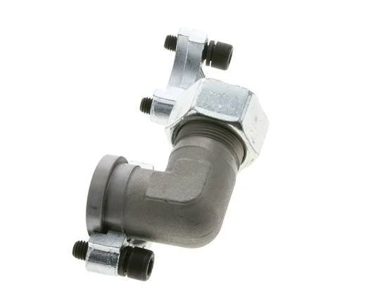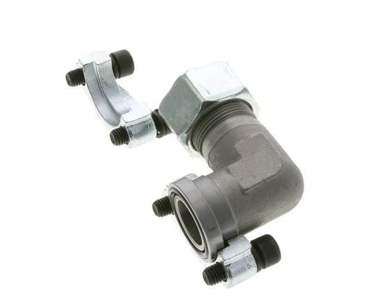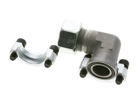 This is an elbow SAE flange with a cutting ring connection port. It adheres to SAE Code 61 (3000-5000 psi working pressure) and has an SAE-4 mounting pattern size of 1 inch. Connection 2 is a 25 mm cutting ring with an M36x2 union nut. It has a flange diameter of 44.5 mm. The body is made of zinc plated steel with an NBR seal. The maximum pressure is 320 bar (4640 psi) and the fitting is suitable for temperatures from -30 to 90 °C (-22 to 194 °F). It is made in accordance with the ISO 6162-1.