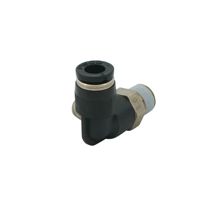 This is an elbow 0.8 mm orifice fitting used for air flow control. It is designed to fix the air flow rate by restricting it with a significantly smaller orifice in the threaded side of the fitting.