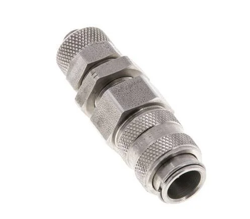 Stainless steel DN 5 air coupling socket with a union nut for 6×8 mm hoses and bulkhead thread. A pneumatic coupling is used to quickly connect air tools to a compressed air line. The coupling requires two parts: the socket (female) and the plug or nipple (male part). When disconnected, the coupling automatically shuts off to maintain the line pressure.