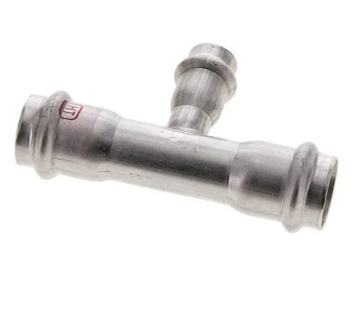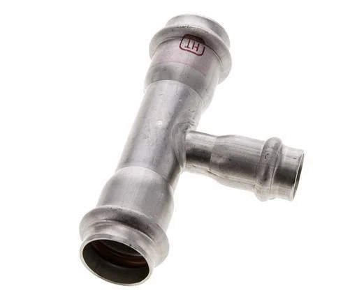 This is a tee press fitting made from stainless steel 1.4404. The fitting has three female press ports. Connection 1 is designed for a tube with an outer diameter of 15 mm, connection 2 and 3 are designed for a tube with an outer diameter of 22 mm. The fitting has an FKM sealing ring. The maximum pressure is 40 bar (580 psi). The fitting is suitable for temperatures from -20 to 200 °C (-4 to 392 °F). Temporary, the max temperature can be +280 °C (536 °F).