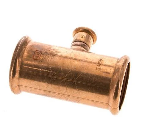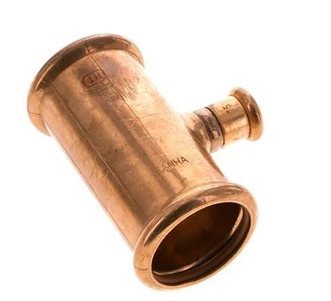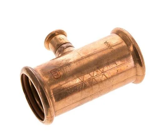 This is a tee press fitting made from copper alloy. The fitting has three female press ports. Connection 1 is designed for a tube with an outer diameter of 15 mm, connection 2 and 3 are designed for a tube with an outer diameter of 42 mm. The fitting has an FKM sealing ring. The maximum pressure is 16 bar (232 psi). The fitting is suitable for temperatures from -20 to 200 °C (-4 to 392 °F). Temporary, the max temperature can be +280 °C (536 °F).