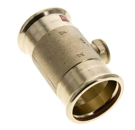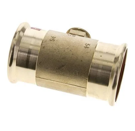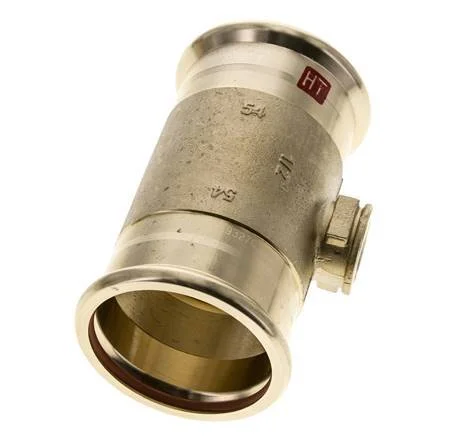 This is a tee press fitting made from copper alloy. The fitting has two female press port and a female threaded port. Connection 1 and 2 are designed for a tube with an outer diameter of 54 mm and connection 3 has Rp 1/2 inch female threads. The fitting has an FKM sealing ring. The maximum pressure is 16 bar (232 psi). The fitting is suitable for temperatures from -20 to 200 °C (-4 to 392 °F). Temporary, the max temperature can be +280 °C (536 °F).