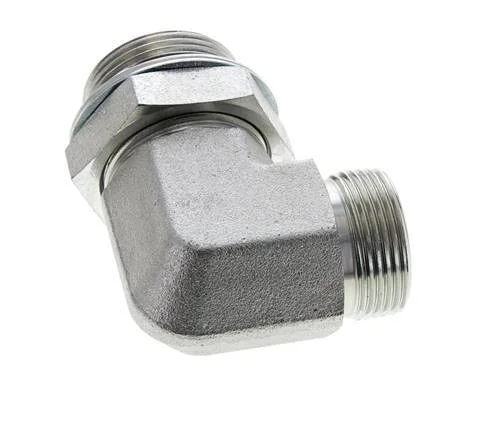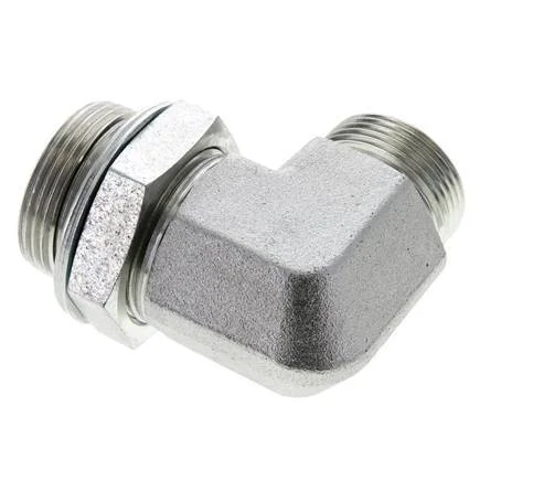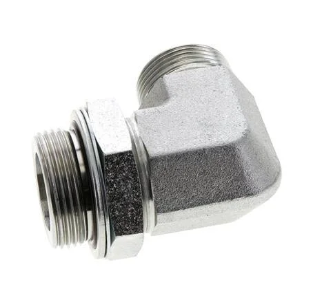 This ORFS elbow screw connection is designed with male ORFS connections. Connection 1 has ORFS male UN 1-7/16inch-12 threads. Connection 2 has male G 1 1/4 inch threads. It comes with a gasket to ensure a proper seal can be made. It is an elbow fitting. It is made out of steel and is galvanic/electrolytic zinc plated for surface protection. It has a elastomer seal. At 20 °C (68 °F), it can handle a maximum pressure of 250 bar (3626 psi). The input and the output are at a 90° angle.