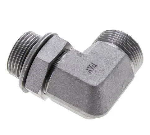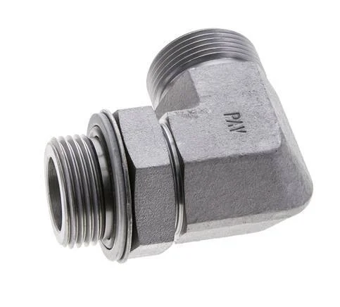 This ORFS elbow screw connection is designed with male ORFS connections. Connection 1 has ORFS male UN 1-7/16inch-12 threads. Connection 2 has male G 1 inch threads. It comes with a gasket to ensure a proper seal can be made. It is an elbow fitting. It is made out of steel and is galvanic/electrolytic zinc plated for surface protection. It has a elastomer seal. At 20 °C (68 °F), it can handle a maximum pressure of 315 bar (4569 psi). The input and the output are at a 90° angle.