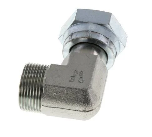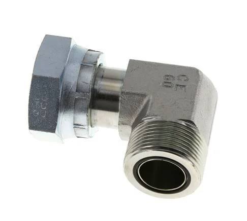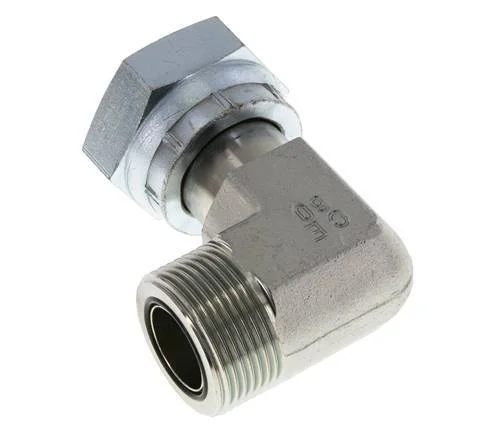 This ORFS elbow screw connection is designed with an ORFS female connection and an ORFS male connection at an angle. Connection 1 has ORFS male UN 1-7/16inch-12 threads. Connection 2 has ORFS female UN 1-7/16inch-12 threads. It comes with a gasket to ensure a proper seal can be made. It is an elbow fitting. It is made out of steel and is galvanic/electrolytic zinc plated for surface protection. At 20 °C (68 °F), it can handle a maximum pressure of 400 bar (5802 psi). The input and the output are at a 90° angle.