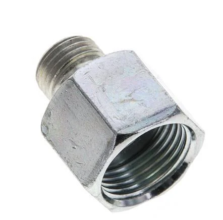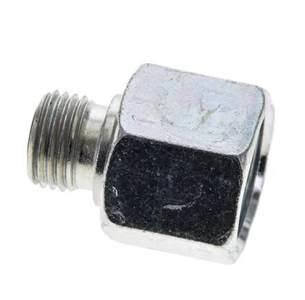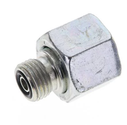 This ORFS elbow screw connection is designed with a larger male ORFS connection point and a smaller female ORFS conneciton port. Connection 1 has ORFS male UN 13/16inch-16 threads. Connection 2 has ORFS female UNF 9/16inch-18 threads. It comes with a gasket to ensure a proper seal can be made. It is a straight fitting. It is made out of steel and is galvanic/electrolytic zinc plated for surface protection. At 20 °C (68 °F), it can handle a maximum pressure of 630 bar (9138 psi).
