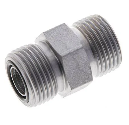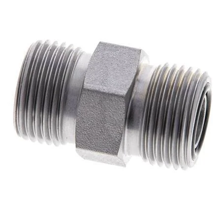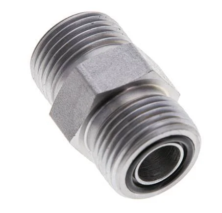 This straight ORFS screw connection is designed with male to male ORFS connection points. Connection 1 has ORFS male UN 13/16inch-16 threads. Connection 2 has ORFS male UN 13/16inch-16 threads. It comes with a gasket to ensure a proper seal can be made. It is a straight fitting. It is made out of steel and is galvanic/electrolytic zinc plated for surface protection. At 20 °C (68 °F), it can handle a maximum pressure of 630 bar (9138 psi).