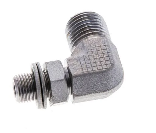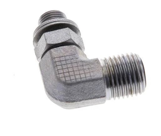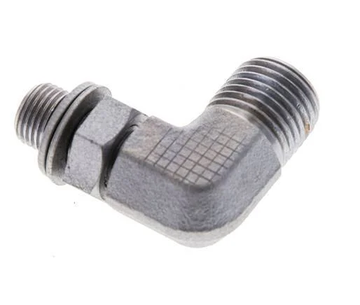 This ORFS elbow screw connection is designed with male ORFS connections. Connection 1 has ORFS male UNF 9/16inch-18 threads. Connection 2 has male G 1/8 inch threads. It comes with a gasket to ensure a proper seal can be made. It is an elbow fitting. It is made out of steel and is galvanic/electrolytic zinc plated for surface protection. It has a elastomer seal. At 20 °C (68 °F), it can handle a maximum pressure of 400 bar (5802 psi). The input and the output are at a 90° angle.