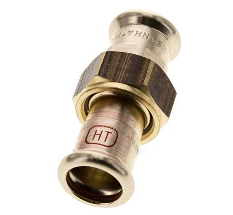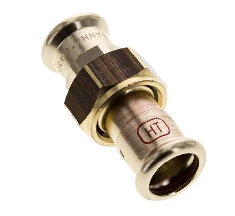 This is a union straight press fitting made from copper alloy. The fitting has two female press ports. Connection 1 and 2 are designed for a tube with an outer diameter of 18 mm. The fitting has an FKM sealing ring. It also has a flat seal made of centellen. The maximum pressure is 16 bar (232 psi). The fitting is suitable for temperatures from -20 to 200 °C (-4 to 392 °F). Temporary, the max temperature can be +280 °C (536 °F). The fitting length is 70 mm.