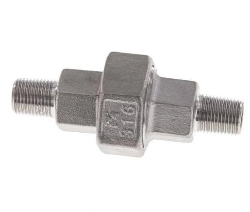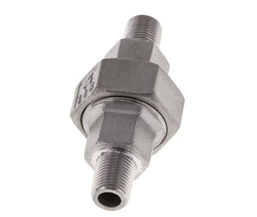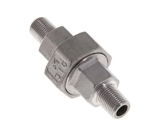 This is a union straight connector with male (R) threads. It is used in low-pressure applications up to 16 bar (224.8 psi). Stainless steel 316 (1.4408) fittings have excellent corrosion resistance (better than stainless steel 304). It has a flat seal made of PTFE.
