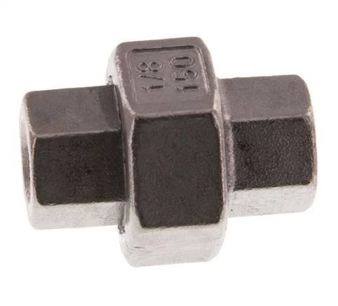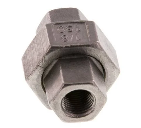 This is a union straight connector with female (Rp) threads. It is used in low-pressure applications up to 16 bar (224.8 psi). Stainless steel 316 (1.4408) fittings have excellent corrosion resistance (better than stainless steel 304). It has a flat seal made of PTFE.