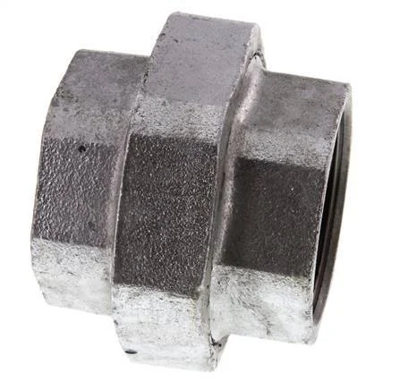 This is a union straight connector with female (Rp) threads. It is used in low-pressure applications up to 25 bar (351.25 psi). It is made of malleable cast iron and has a zinc coating for corrosion protection. It has a flat seal.