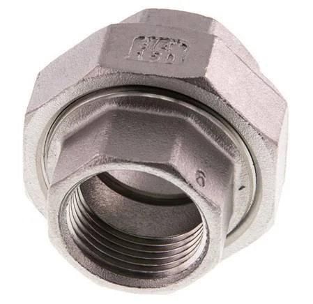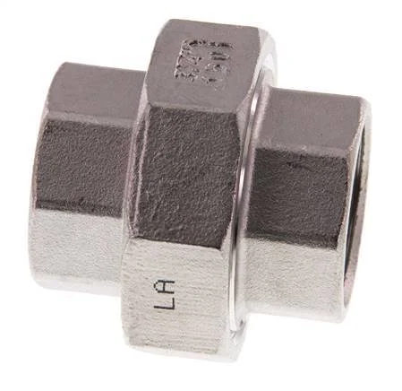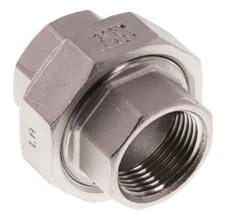 This is a union straight connector with female (Rp) threads. It is used in low-pressure applications up to 16 bar (224.8 psi). Stainless steel 316 (1.4408) fittings have excellent corrosion resistance (better than stainless steel 304). It has a flat seal made of PTFE.