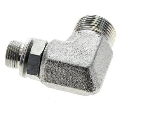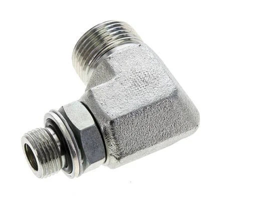This ORFS elbow screw connection is designed with male ORFS connections. Connection 1 has ORFS male UNS 1inch-14 threads. Connection 2 has male G 3/8 inch threads. It comes with a gasket to ensure a proper seal can be made. It is an elbow fitting. It is made out of steel and is galvanic/electrolytic zinc plated for surface protection. It has a elastomer seal. At 20 °C (68 °F), it can handle a maximum pressure of 400 bar (5802 psi). The input and the output are at a 90° angle.