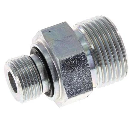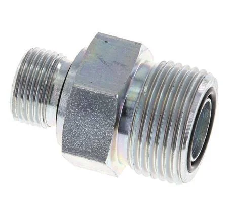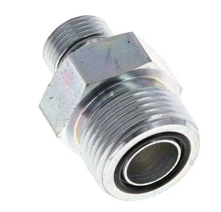 This straight ORFS screw connection is designed with a male ORFS connection point to male threads. Connection 1 has ORFS male UNS 1inch-14 threads. Connection 2 has male G 3/8 inch threads. It comes with a gasket to ensure a proper seal can be made. It is a straight fitting. It is made out of steel and is galvanic/electrolytic zinc plated for surface protection. It has a elastomer seal. At 20 °C (68 °F), it can handle a maximum pressure of 400 bar (5802 psi).