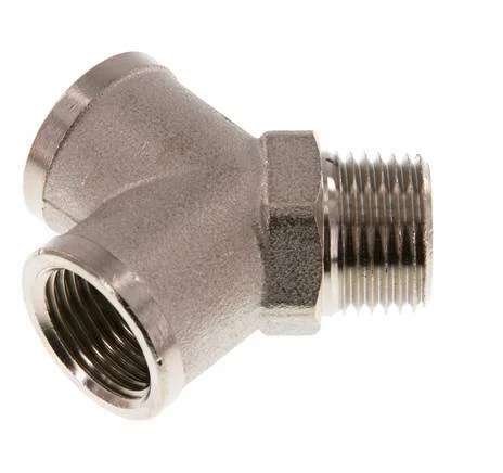 This is an Y fitting. It is made of nickel-plated brass, which resists rust better than steel fittings and unfinished brass fittings. The maximum operating pressure is 16 bar (224.8 psi).